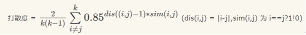 这里需要解释一下,这里首先是对两两物品(不同的位置)计算为打散度后,得出整体的打散度。相似函数sim代表两两是否相同,相同则为1,不相似则为0。关于两个内容之间距离对打散度的影响,不能是线性的关系,因为随着两个商品出现的位置越来越大,用户对重复商品的感受会逐渐的减弱(很近的位置就有两个相似的内容觉得会有些重复,但是如果比较远的位置有两个相似的一般是可以接受的),一般双列流屏幕出现内容大概是4个,0.85^(5-1) 大概在 0.5左右,所以如果是5以内,则打散度会很低,但是如果>5了,打散度就不会衰减的比较厉害了。 相似的两个物品越靠近,权重越大。