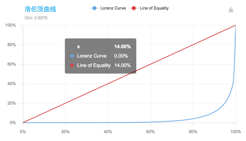 覆盖率反应出的分布情况是比较有限的,我们只能知道哪些类目覆盖了,哪些没有覆盖,那类目之间究竟哪个类目占的多,哪个类目占的少呢?为了更细致地描述推荐系统发掘长尾的能力,我们需要统计推荐列表中不同类目出现次数的分布,引入基尼系数来评价。