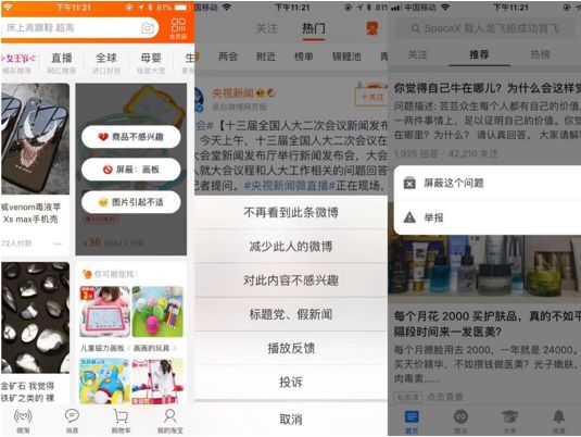 定义:负反馈相当于一个轻量级便携的用户反馈,用户可以直接对推荐出的内容给与反馈,推荐系统在拿到了用户实时反馈后就会立刻针对反馈信息对推荐结果做出相应的调整,而我们也可以在事后拿到负反馈的整体数据来评价推荐系统在用户侧是否有重大舆情产生。一般app的推荐都会有负反馈机制,如图: