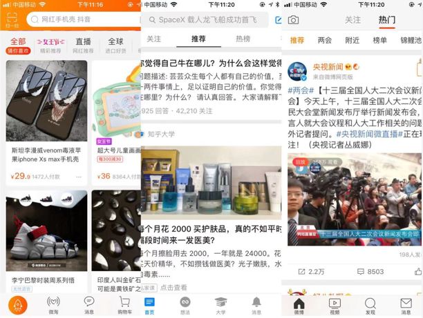 目前推荐技术的应用已经非常较普及了,新闻、商品、问答、音乐,几乎都会用到推荐算法来为你呈现内容。下面是淘宝、知乎、微博三个app的推荐模型,可以看到推荐都在非常重要的位置。