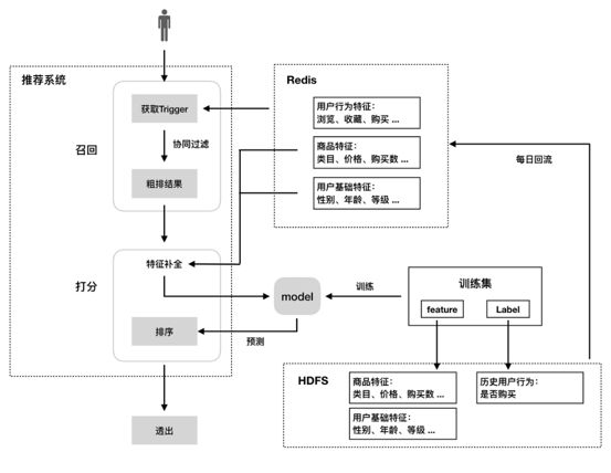 打分过程中的模型是需要提前训练和部署,训练集的来源就是用户的实时行为加上用户和商品的特征。feature的构成是用户的特征和商品的特征,label则是用户是否点击了该商品。
