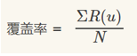 推荐系统能够推荐出来的“商品/类目”占“总商品/类目”集合的比例。假设系统的用户集合为U,推荐系统给每个用户推荐一个长度为N的物品列表R(u) ,总物品为N。那么:
