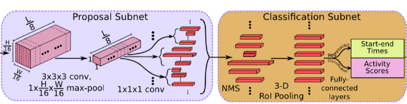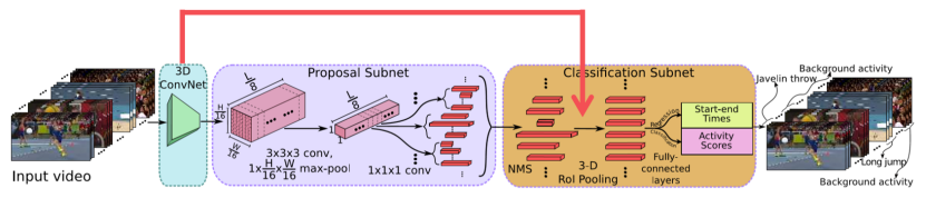 下图1可以清晰看出网络结构信息。输入为视频流(帧),经过C3D(类似VGG、ResNet等特征提取网络,这里对视频也就是四维数据提取特征,增加特征L即视频帧维度)网络提取特征图。然后将提取的特征经过动作提议网络得到一系列粗略的动作序列,包含提取到的动作序列的中心点和长度。最后,经过分类网络和精调,得到动作序列的具体开始和结束时间以及动作类别。