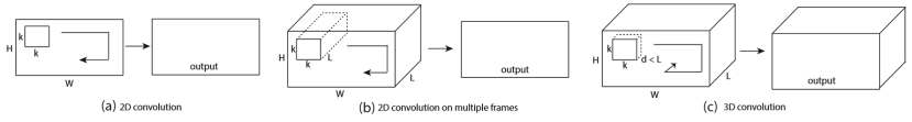此部分采用C3D网络架构提取视频序列帧的特征,类似于2D卷积,3D卷积的形象描述如下图3(c)所示。3D卷积对H、W和L三个维度都进行卷积,而2D卷积(多通道(b))只对H和W两个维度进行卷积,因此3D卷积得到的是三维输出,而2D卷积得到的是二维输出。
