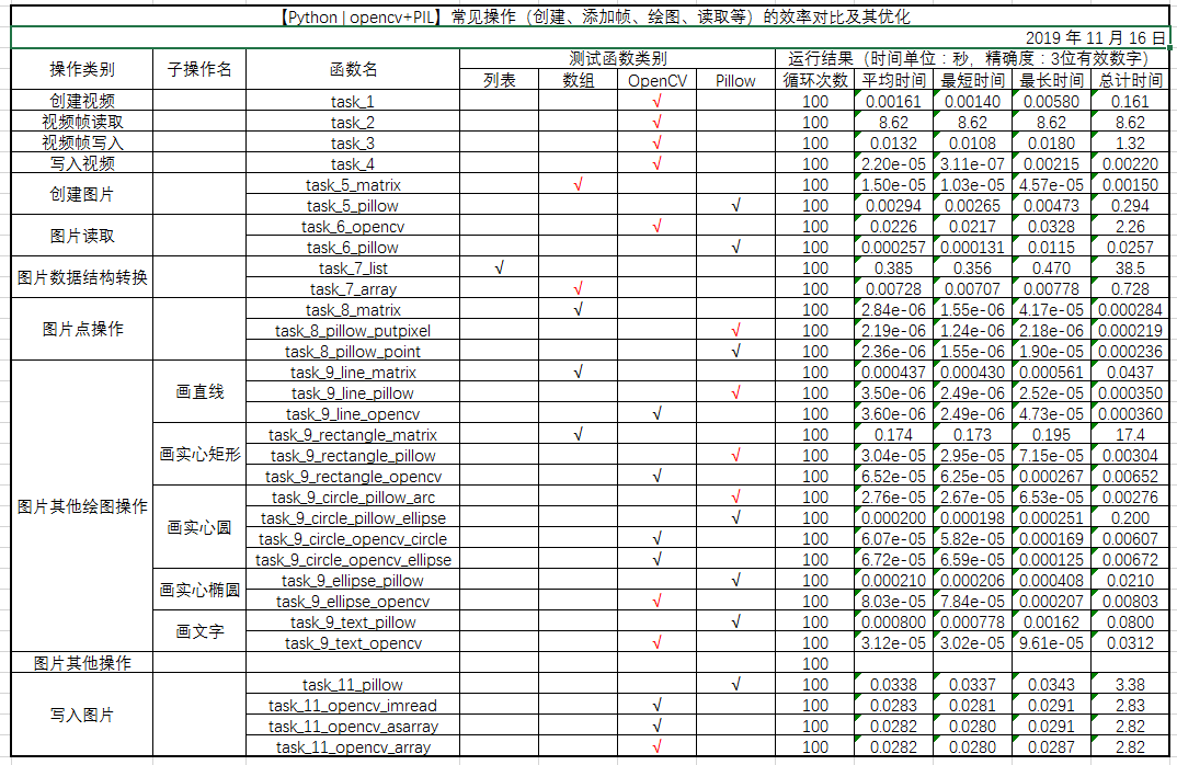 时间单位:秒,精确度:3位有效数字,制作成表格(红字表示所在子操作名中平均时间最短的函数,如若平均时间最短按照时间排列顺序依次比较)(图片读取一栏的红字标错位置了,应该打在pillow的下面):