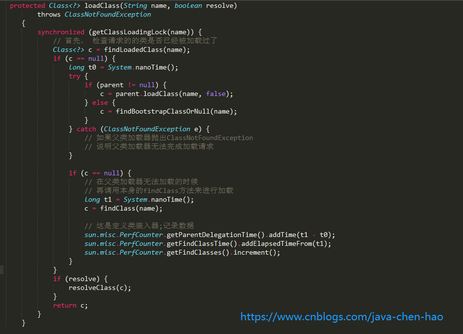 非常简单:所有的代码都在java.lang.ClassLoader中的loadClass方法之中,代码如下: