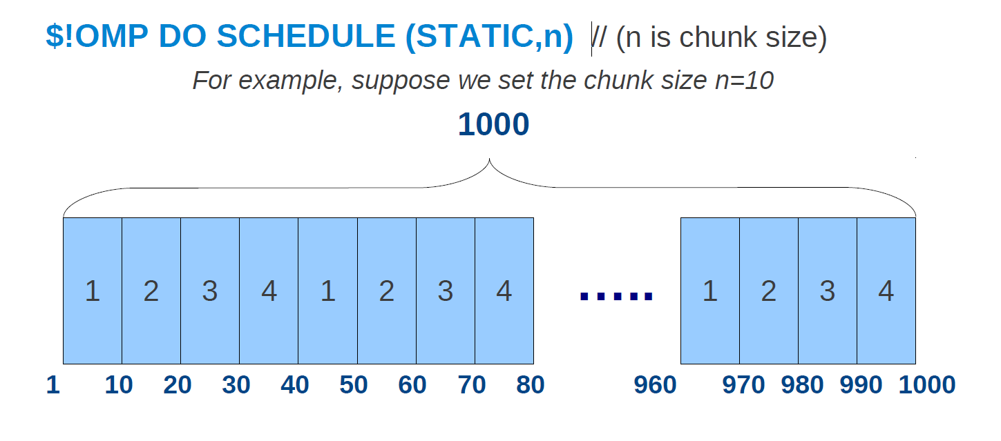 尽管openmp标准没有指定循环应该如何分区,但默认情况下,大多数编译器在N/p(N 迭代数,p线程数)块中分割循环。这称为静态调度(块大小为N/p)