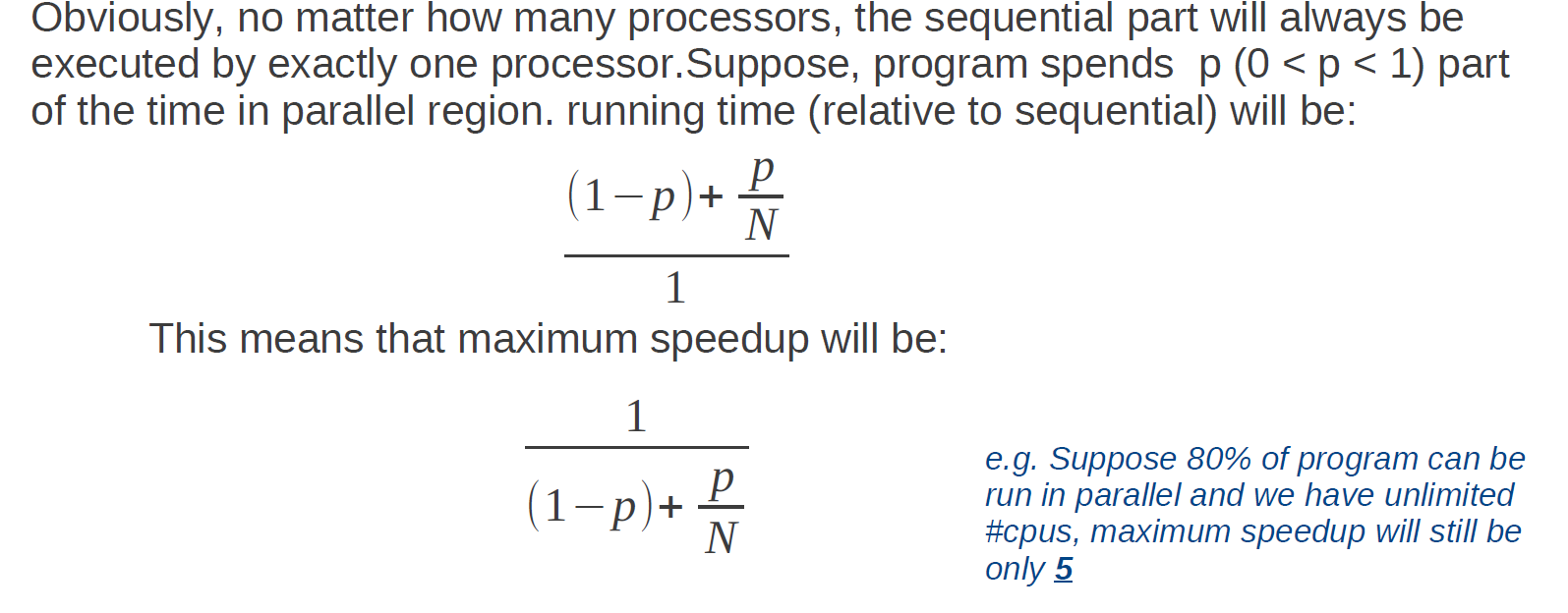 显然,无论有多少个处理器,串行部分只在一个处理器执行。假设,程序花费总时间的p(0<p<1)部分在并行区域,(相对于串行的)运行时间将是: