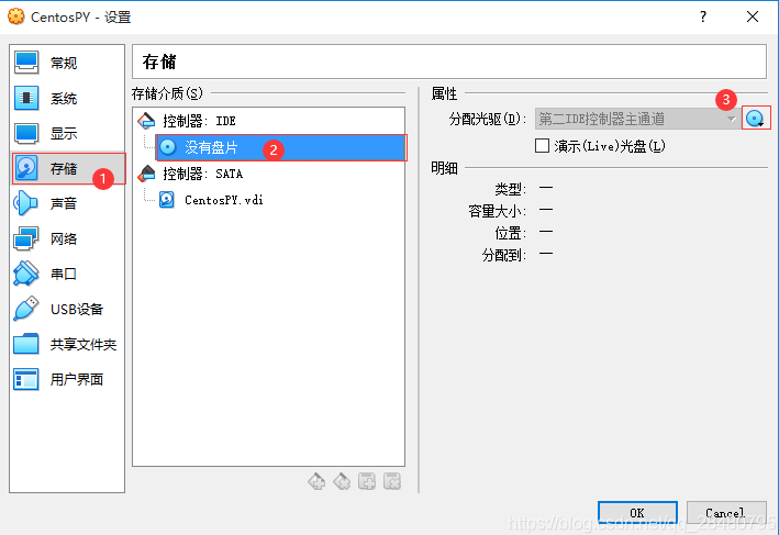 选择“存储”,在属性中选择镜像文件(deepin.ios):