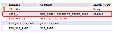 查看我们的数据库,发现有如下索引,其中'uniq_1'索引类型为'Unique'