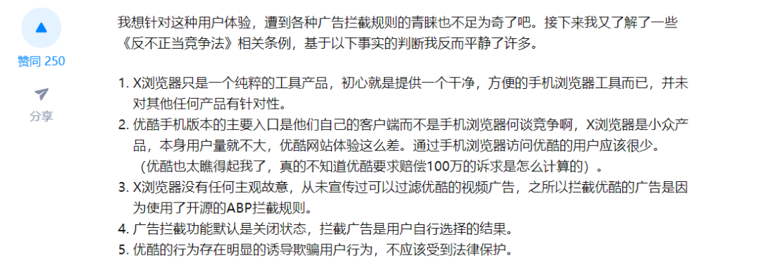 但作者表示自己并没有刻意针对优酷,在使用 ABP 时也不知道会拦截优酷的广告。该作者认为优酷本身的广告用户体验极差,所以才会被 ABP 规则拦截广告。其观点如下: