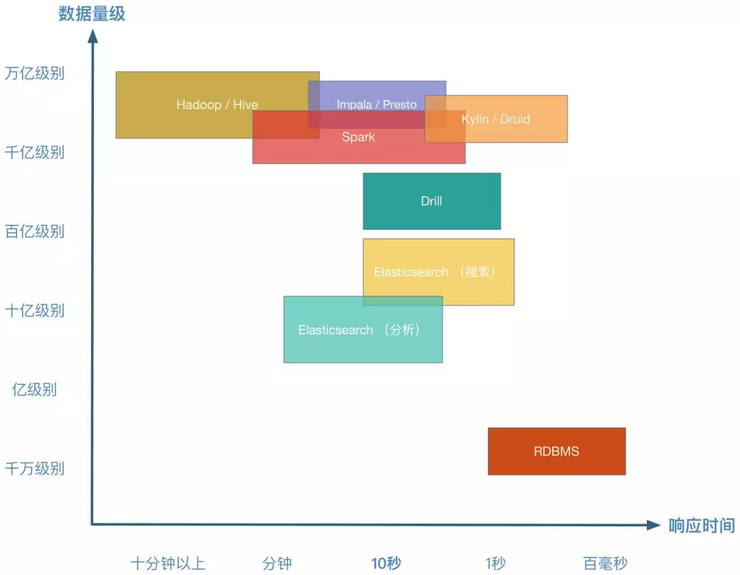 以上是一些主流的分析型引擎在各个数据量级下大致的表现结果,这个图表中的数据仅仅是在大部分场景下的一般表现情况(并非精确测试结果,仅供参考)。不过值得注意的是,虽然看起来我们总是希望响应时间越少越好,数据量级越高越好,但要知道大数据领域并没有银弹,能够解决所有的问题。每个技术组件都是牺牲了部分场景,才能在自己的领域中保持优势。
