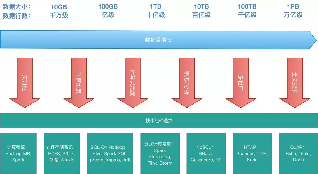 其中数据量级作为一个重要的因素影响着我们对于技术选型的决定,另外在数据量的变化之外各种业务场景的需要也会影响我们对技术组件的选择。