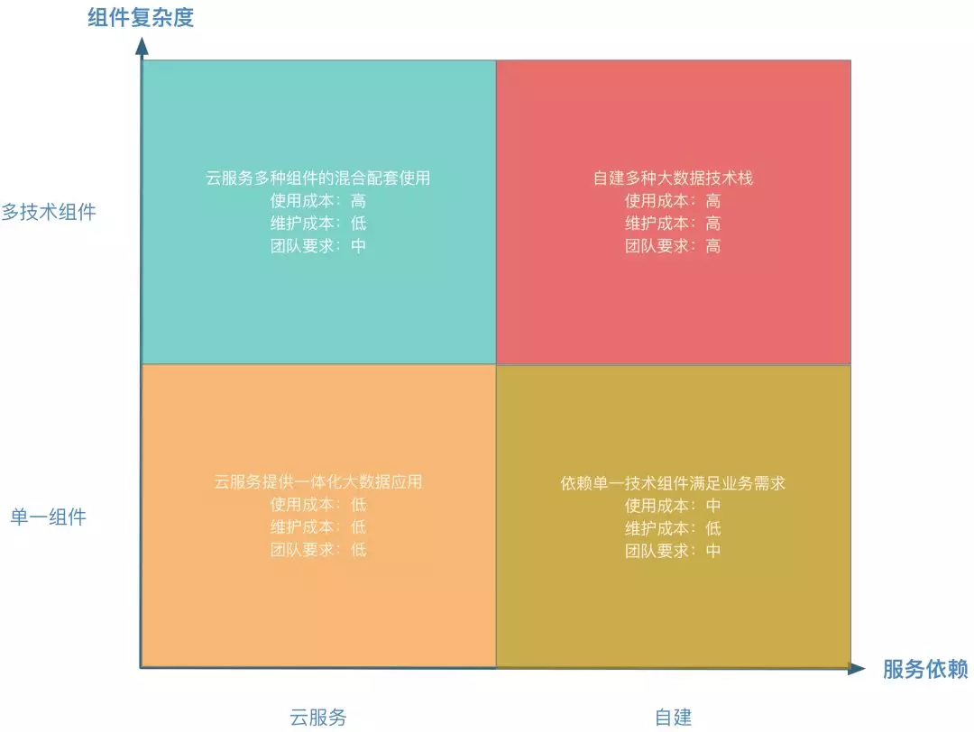 从上图可以看出大数据平台可以根据服务依赖(是依赖云服务还是自建大数据平台)和技术组件的复杂度分为四个象限。