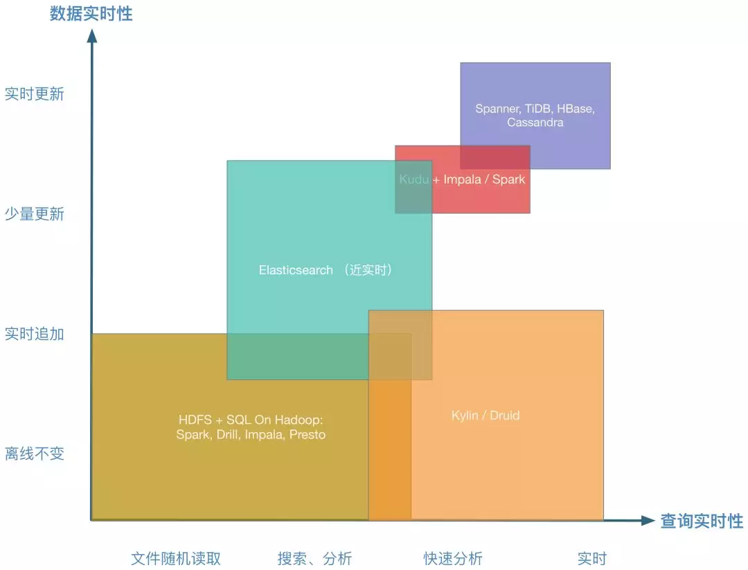 可以从这个图中看出,一般在实时领域会选择 HBase,Cassandra 这种能支持事务同时支持高更新吞吐量的技术组件,或者也可以选择 TiDB、Spanner、Kudu 等这种 HTAP 组件,同时支持事务和分析的分布式数据库。