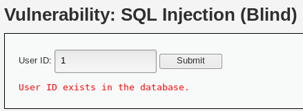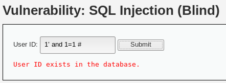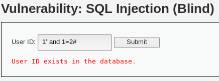 输入1、1’ and 1=1 #、1’ and 1=2#得到结果User ID exists in the database.可以判断存在sql注入