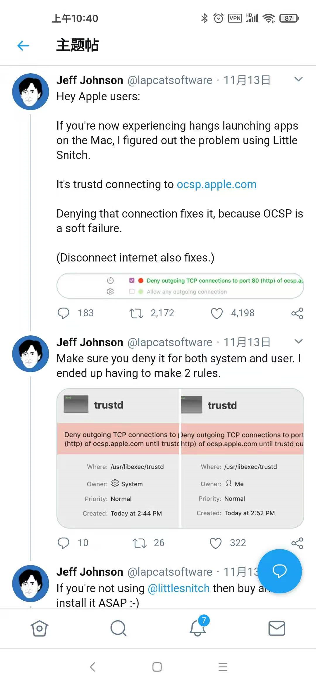 不久之后,一些Mac用户还发现,当尝试用trustd(一个负责与Apple的服务器进行核对,以确认应用程序是否经过认证的MacOS进程)与ocsp.apple.com联系时,发生反复失败的情况。这导致App启动时发生系统性大规模的速度降低。