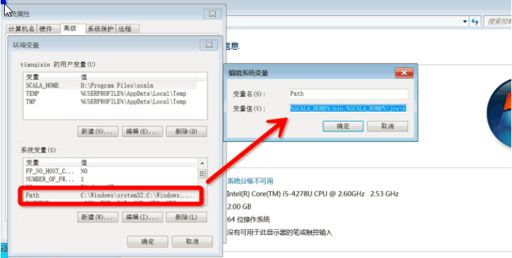 设置 Path 变量:找到系统变量下的"Path"如图,单击编辑。在"变量值"一栏的最前面添加如下的路径: %SCALA_HOME%\bin;%SCALA_HOME%\jre\bin;注意:后面的分号 ; 不要漏掉。