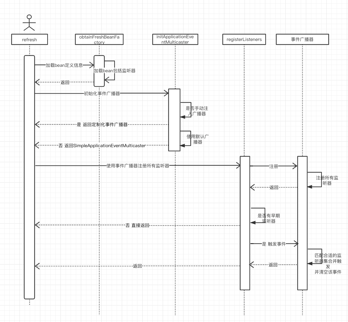 源码分析到这里基本串联了整个流程,用一张图说明容器刷新时候事件调用链图,展示整个过程的数据流: