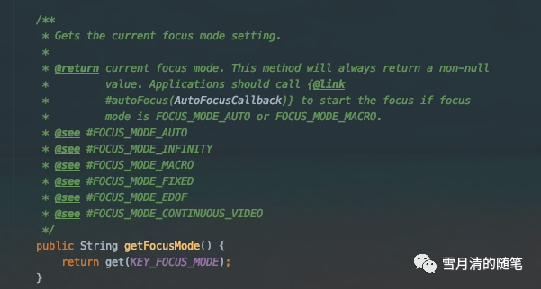// 连续自动对焦caf,预览场景变化时会自动去对焦Camera.Parameters.FOCUS_MODE_CONTINUOUS_VIDEOCamera.Parameters.FOCUS_MODE_CONTINUOUS_PICTURE// 单次自动对焦af,下发一次请求则对焦一次Camera.Parameters.FOCUS_MODE_AUTO