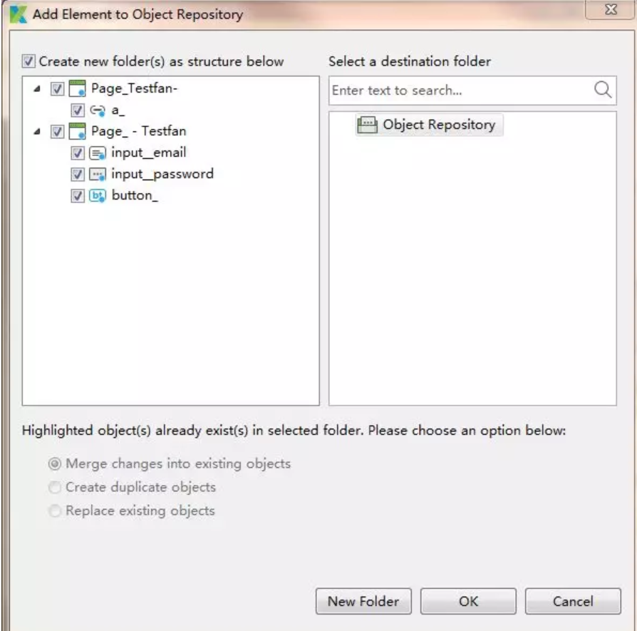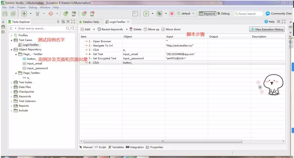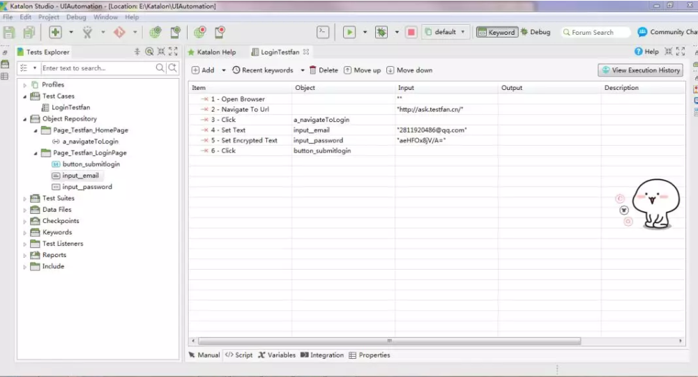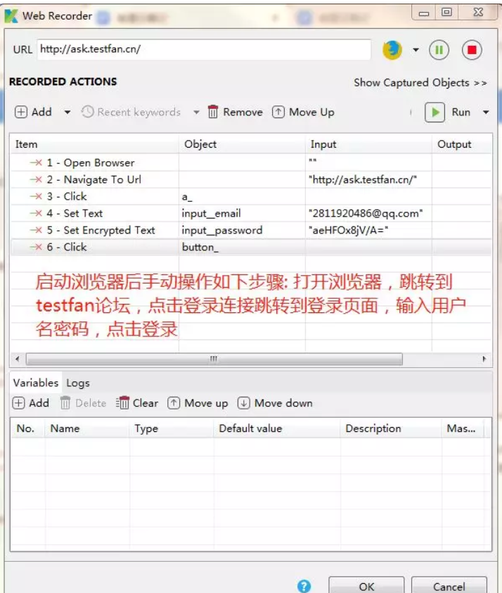 点击录制按钮,选择浏览器,Katalon启动浏览器并记录你在浏览器上的所有操作,并把操作转化成TestCase中的步骤。本示例在启动浏览器以后实现了Testfan论坛的登录功能,在页面手动操作完登录功能以后,会自动生成如下测试用例,并把登录页面识别出来的对象保存在ObjectRepository当中。