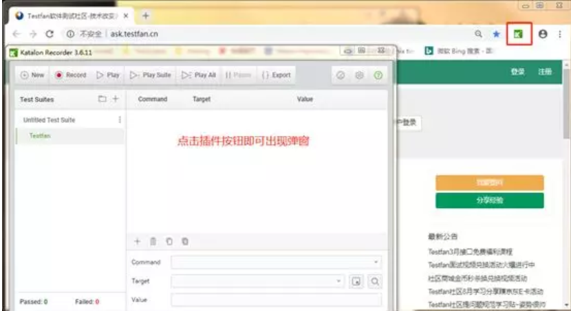 KatalonAutomation Record类似于 Selenium IDE for Firefox,Selenium IDE for Firefox已经退出历史舞台,官方宣称SeleniumIDE是基于旧技术实现,在火狐55及之后的新版本上不再支持了。KatalonAutomation Record支持Firefox和Chrome,它的安装和使用很简单,以Chrome为例直接把插件安装到浏览器以后,通过浏览器启动插件,点击Record即可记录用户在界面的操作并形成TestCase,点击Play即可完成录制回放和功能验证。