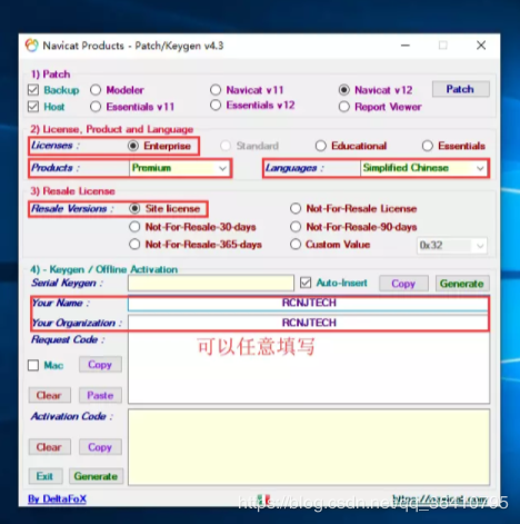 3.7 将Navicat手动激活窗口的请求码框中内容复制到注册机Request Code框中,点击Activation Code下面的Generate按钮(若此处出现错误,要么你未完全按照教程来,要么你所安装的版本高于注册机所支持的版本):