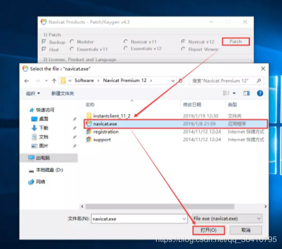 3.3 找到Navicat Premium 12安装路径下的navicat.exe,选中并点击打开: