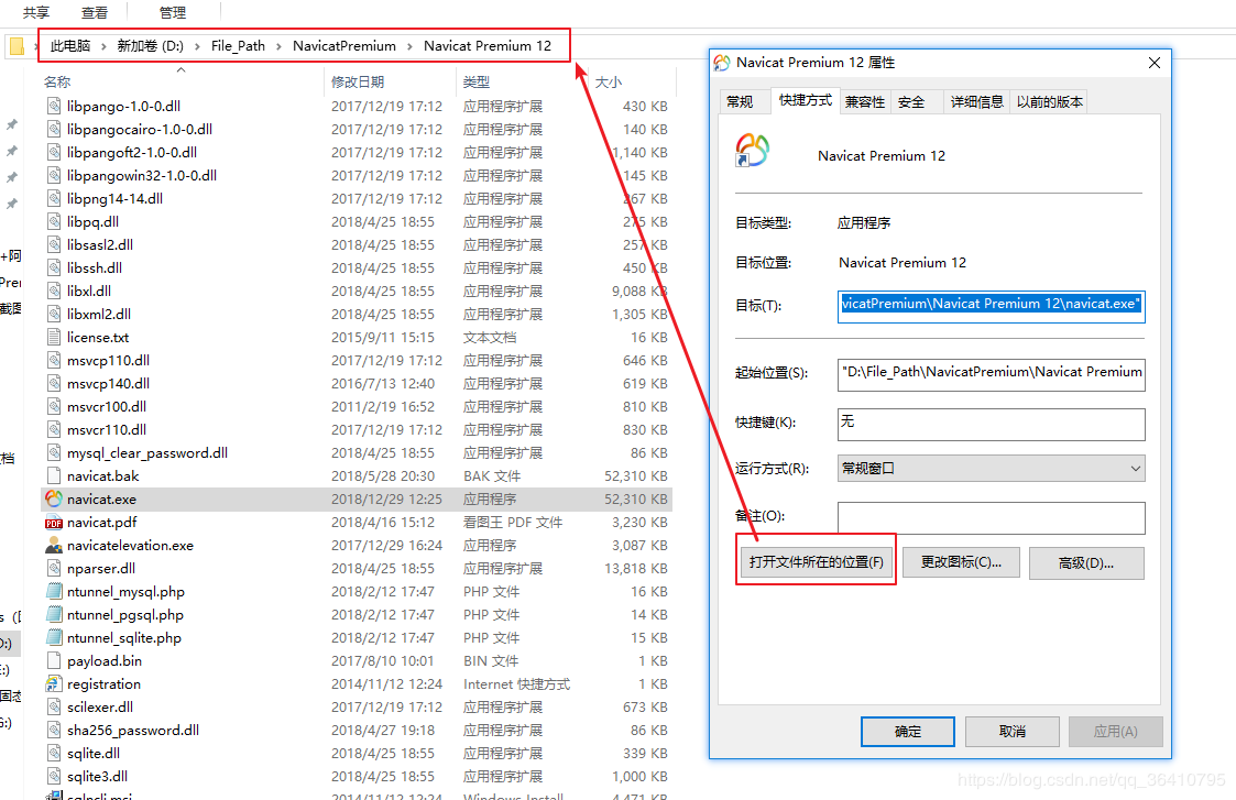 5、找到Navicat Premium 12右键,打开文件所在位置的安装根目录,将复制的文件粘贴进去即可:
