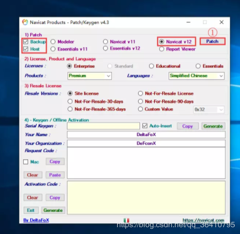 3.2 打开注册机后,在1) Patch,勾选Backup、Host和Navicat v12,然后点击Patch按钮:
