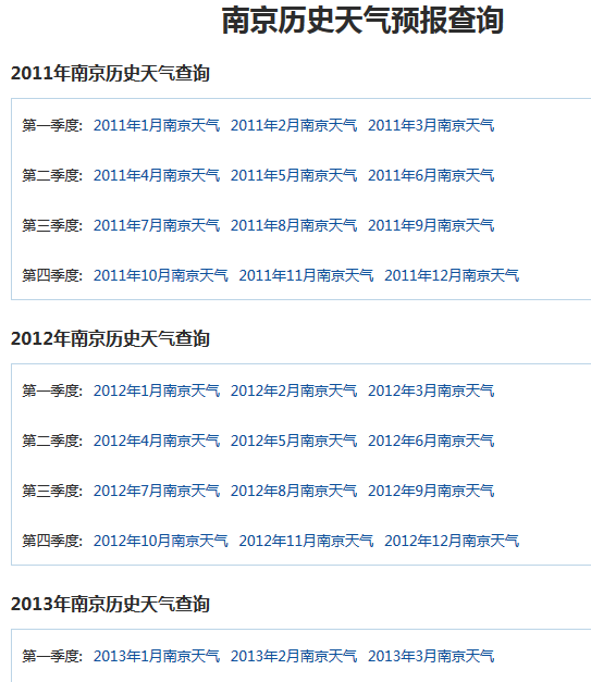 - 爬取主网页,获取进入每个南京市具体年份月份的天气数据的链接