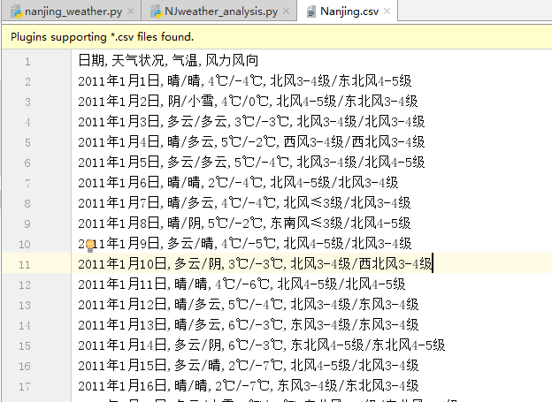 这里只爬取了南京市的历史天气,感兴趣的朋友可以尝试爬取更多城市的,甚至可以在此基础上编写一个小软件,随时随地查看不同地区的历史天气,不过前提是该网站的源代码不发生大变动。