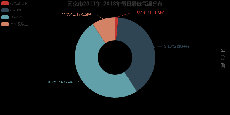 79 pie2 = Pie('南京市2011年-2018年每日最低气温分布', title_pos='center')