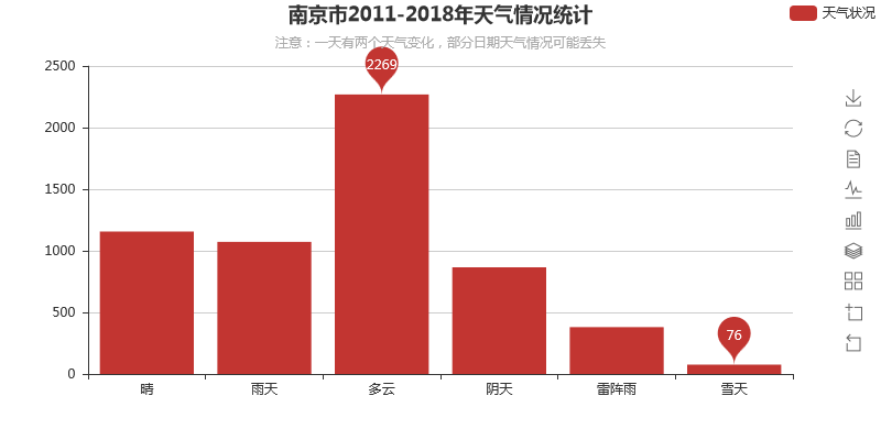 114 bar = Bar('南京市2011-2018年天气情况统计', '注意:一天有两个天气变化,部分日期天气情况可能丢失', title_pos='center')