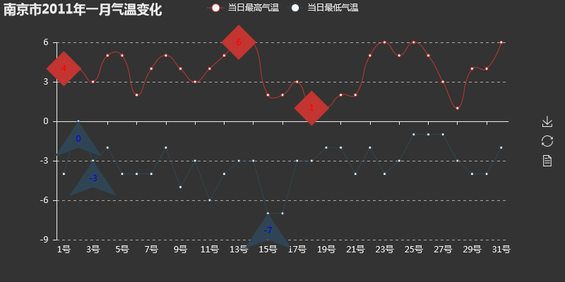28 line.add('当日最高气温', attr, Jan_Htemps, mark_point=['average', 'max', 'min'], #显示平均、最大/小值