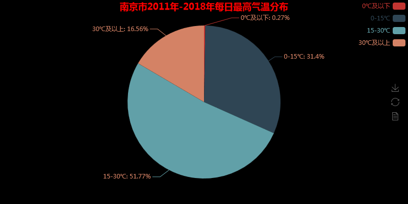 68 pie = Pie('南京市2011年-2018年每日最高气温分布', title_pos='center', title_color='red') #绘制饼图,标题位于中间,标题颜色