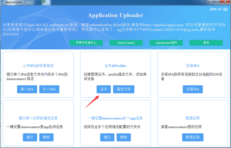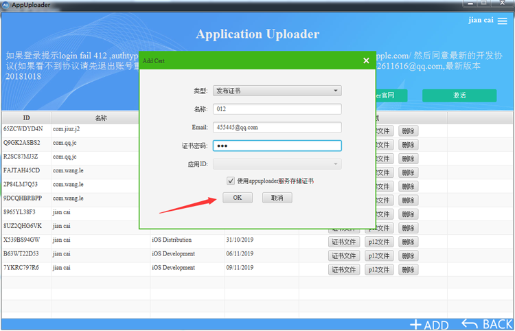 1.1、下载启动Appuploader软件登录苹果开发者账号,点击右下角+ADD选择,下拉选择发布证书