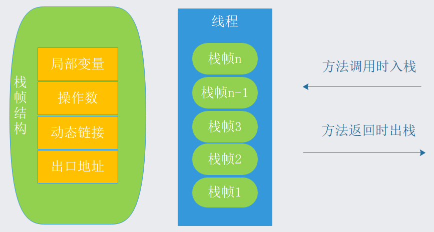 虚拟机栈描述的是Java方法执行的内存模型,每个方法在执行时会创建一个栈帧用于存储放法局部变量表,操作数栈,动态链接,出口信息,如下图,整个栈帧是先入后出。
