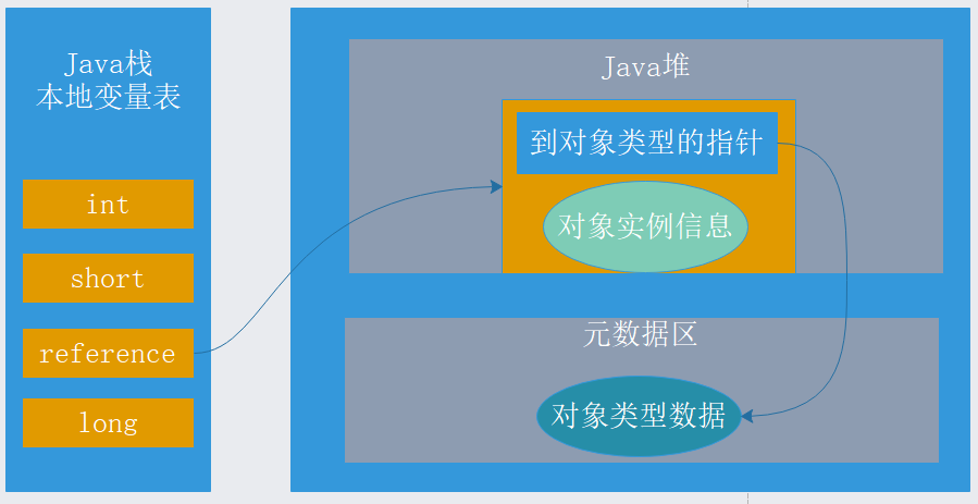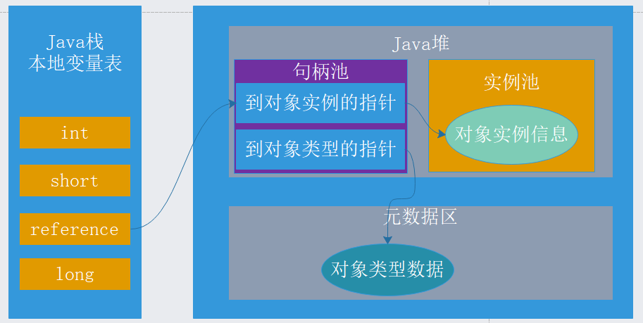 Test方法执行时,创建一个Object对象,我们知道obj是一个引用(reference)类型,所以obj保存在Java栈的本地变量表中,而在Java堆中会保存该引用的实例化对象,Java堆中还必须包含能查找到此对象类型数据的地址信息(如对象类型、父类、实现的接口,方法等)这些类型数据则保存在元数据区域中。一般对象引用到对象实例和对象类型指向有两种方法,一种是句柄池方式,一种是直接指针方式。这两种对象的访问方式各有优势,使用句柄访问方式的最大好处就是reference中存放的是稳定的句柄地址,在对象的移动(垃圾收集时移动对象是非常普遍的行为)时只会改变句柄中的实例数据指针,而reference本身不需要修改。使用直接指针访问方式的最大好处是速度快,它节省了一次指针定位的时间开销。目前Java默认使用的HotSpot虚拟机采用的便是是第二种方式进行对象访问的,下面用两张图来表述一下这两种方式。