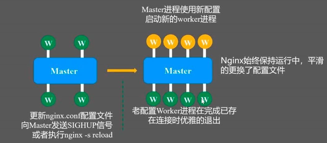 1. 向master进程发送HUP信号(reload命令)2. master进程校验配置语法是否正确(因此我们在进行reload的时候,不一定非要先执行一个`nginx -t`)3. master进程打开新的监听端口(可能引入了https,监听了443,此时work就会共用打开的端口)4. master进程用新配置启动新的worker子进程5. master进程向老的worker子进程发送Quit信号(在新的版本中nginx添加一个nginx shutdown timeout,这个就是在新老worker子进程同时存在的时候,限制老的worker进程最迟多久退出)6. 老worker进程关闭监听句柄,处理完当前连接后结束进程