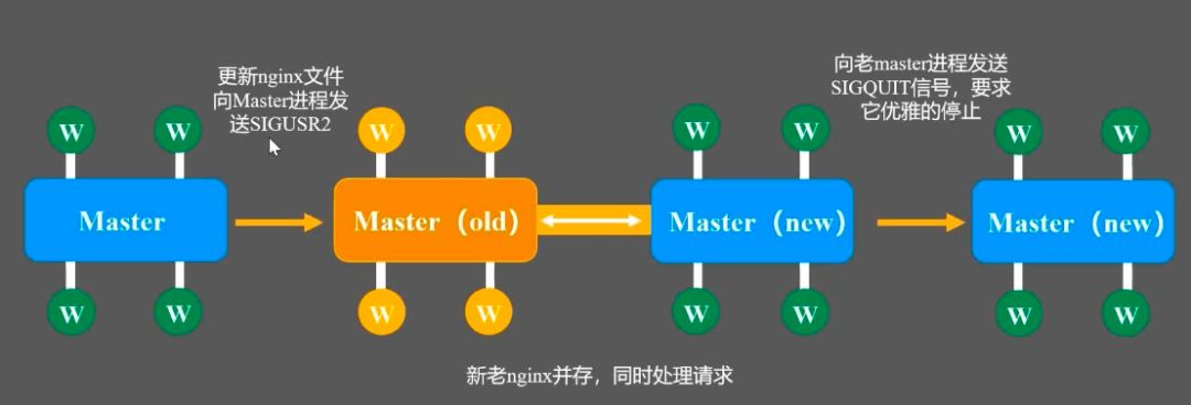 1. 将旧nginx文件换成新的nginx文件(注意备份)2. 向master进程发送USR2信号3. master进程修改pid文件名,加后缀.oldbin4. master进程用新nginx文件启动新master进程5. 向老master进程发送quit信号,关闭老的master进程6. 回滚: 向老master发送HUP,向新master发送quit