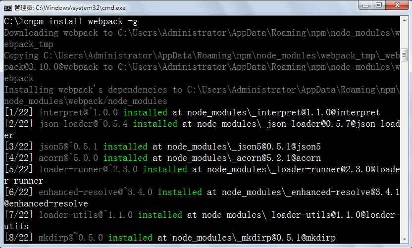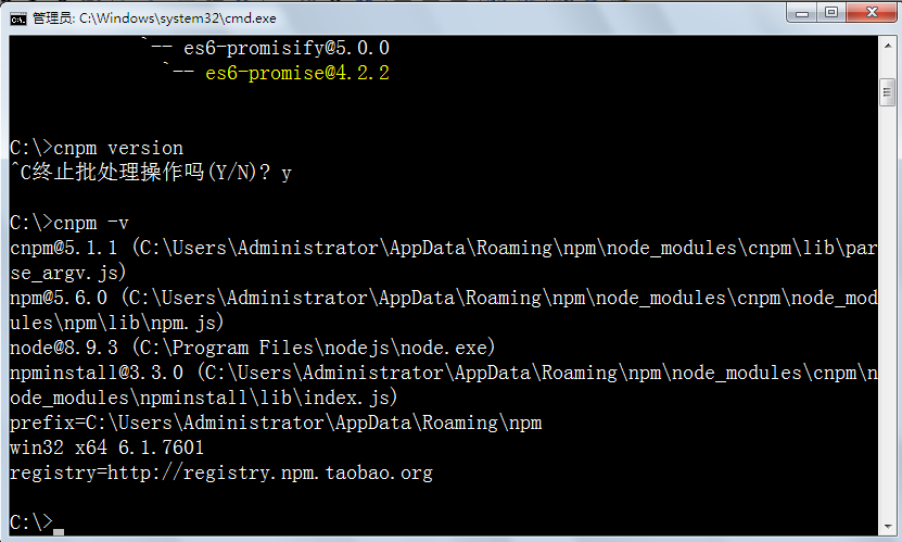 安装这里是因为我们用的npm的服务器是外国,有的时候我们安装“依赖”的时候很很慢很慢超级慢,所以就用这个cnpm来安装我们说需要的“依赖”。安装完成之后输入 cnpm -v,如下图,如果出现相应的版本号,则说明安装成功。