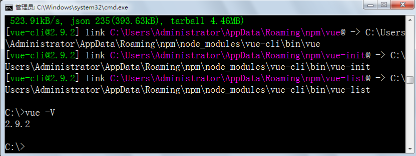 安装完成之后输入 vue -V(注意这里是大写的“V”),如下图,如果出现相应的版本号,则说明安装成功。