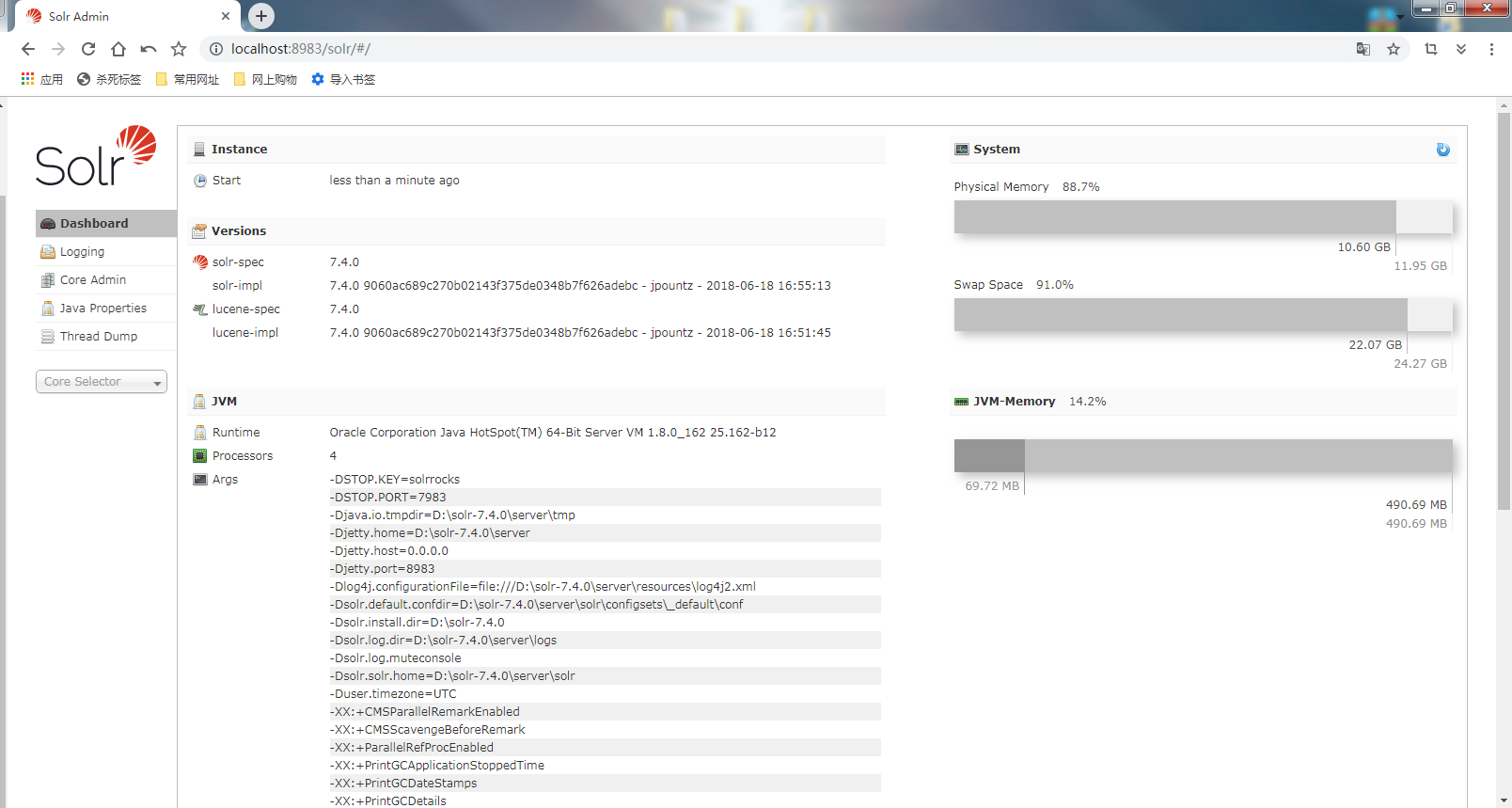 启动成功 在浏览器输入 http://localhost:8983/solr打开,如下图: