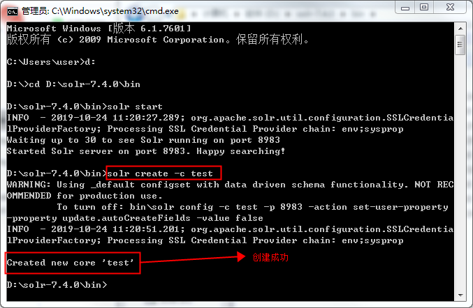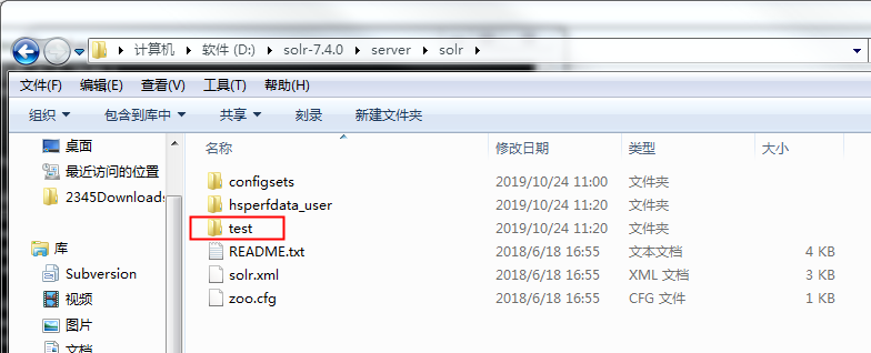 2. 创建core有2中方式,一种是命令 (solr create -c 创建的名称),创建成功后会在 D:\solr-7.4.0\server\solr 目录下出现你创建的core文件夹,如下图: