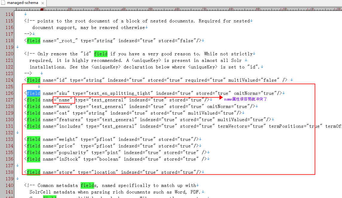 注:一般主键 ID 不用手写定义 field 标签,会自动生成,如果手动定义了在运行的时候回报错。由于managed-schema是复制过来的 最好将文件中定义的
